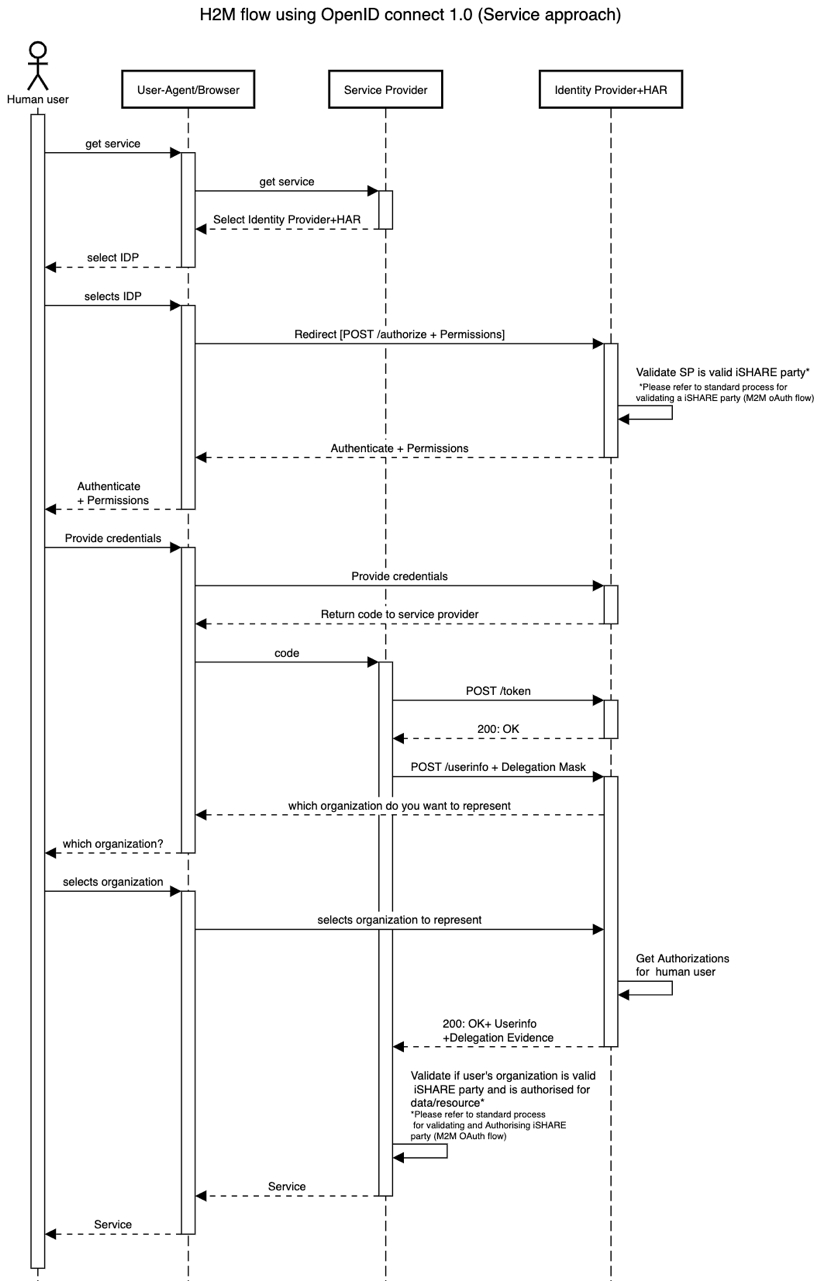 Within iSHARE, authorizations of a human are registered at an Identity Provider, and are retrieved using the userinfo endpoint. For this purpose, there are some modifications to the OpenID Connect Flow. User identities are protected by sharing pseudonyms in order to comply with privacy requirements. Authorization of a human is done by replacing the ‘accessSubject’ value on the root level in delegationEvidence with an iSHARE pseudonym of the human user.